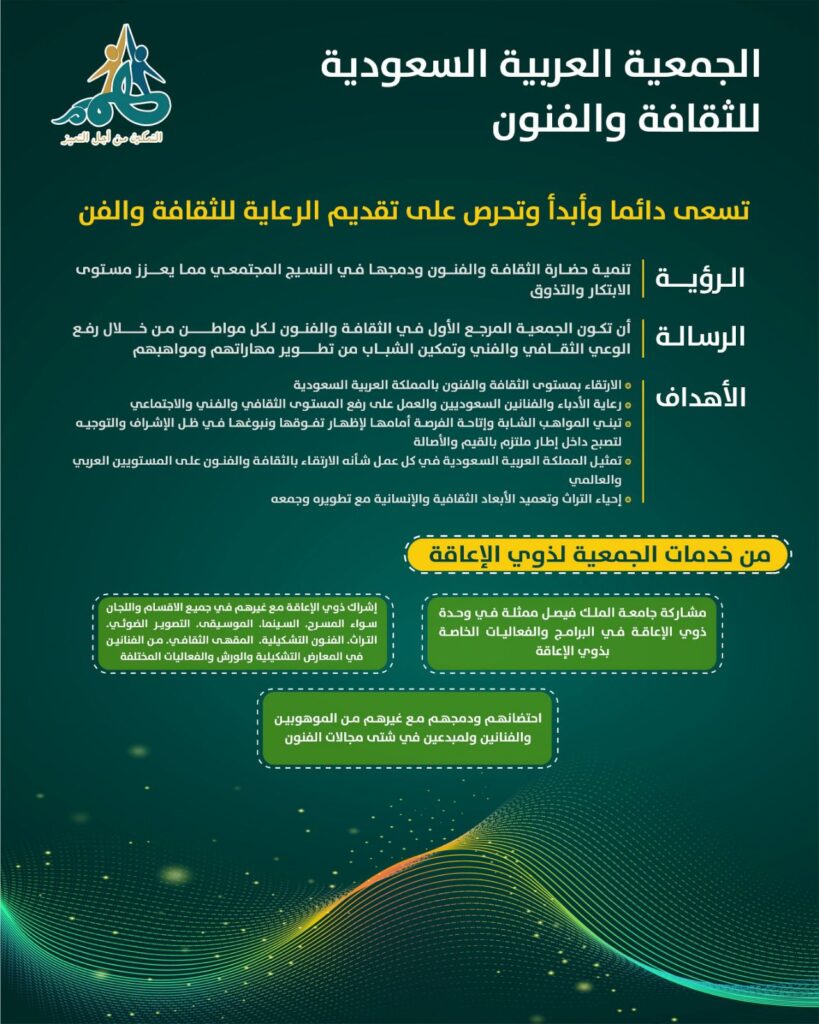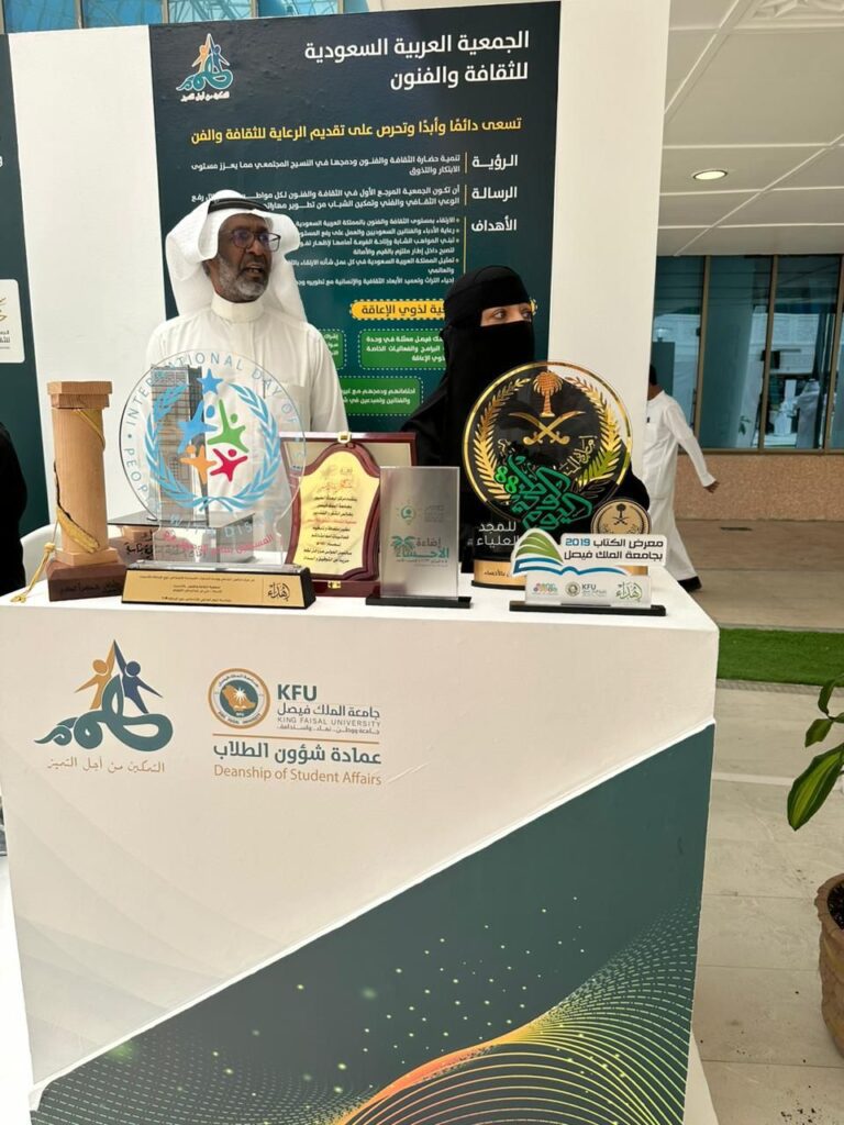 كما شاركت الجمعية بركن تعريفي عنها وخدماتها التي تقدمها و أهدافها ، فيما أفاد مدير الجمعية الاستاذ يوسف الخميس أن ما قدمته الجمعية لذوي الإعاقة وعبر برامجها وفعالياتها التي قدمتها في السنوات الماضية والى غاية اليوم هو احتضانهم ودمجهم ومشاركتهم مع غيرهم من الموهوبين والفنانين والمبدعين في جميع المجالات الفنية والثقافية والتراثية والتصوير والسينما والمسرح والموسيقى وكذلك في الفعاليات والمعارض والبرامج التي تنظمها الجمعية و بشكل مستمر ، وأضاف الخميس بأن مشاركة الجمعية في المعرض مهمة للتعريف بدور الجمعية واهتمامها بالمواهب من مختلف فئات المجتمع مقدما شكره وتقديره لادارة الجامعة وجميع القائمين على المعرض على حسن التنظيم والتميز المعتاد منهم .