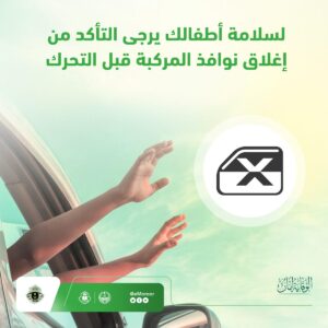 ونصح “المرور” في تغريدة الوالدين، بضرورة التأكّد من إغلاق النوافذ في المركبة قبل التحرُّك لحماية أطفالهم.
