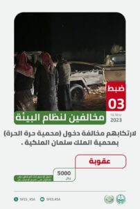 ضبطت القوات الخاصة للأمن البيئي (3) مواطنين مخالفين لنظام البيئة، لارتكابهم مخالفة دخول محمية حرة الحرة، المحظور دخولها بدون تصريح، بمحمية الملك سلمان الملكية ويستقلون مركبة بدون لوحات وتم إحالتهم للجهة المختصة لاستكمال الإجراءات اللازمة بحقهم.