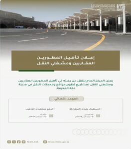 أعلنت الهيئة الملكية لمدينة مكة المكرمة والمشاعر المقدسة، ممثلة بالمركز العام للنقل عن رغبتها في تأهيل المطورين العقاريين ومشغلي النقل لمشاريع تطوير مواقع ومحطات النقل في مدينة مكة المكرمة.