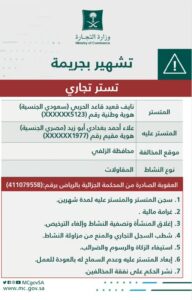 شهرت وزارة التجارة بـ “نايف قعيد قاعد الحربي” سعودي الجنسية يحمل الهوية الوطنية المنتهية بالرقم (XXXXXX5123) و”علاء أحمد بغدادي أبو زيد” مصري الجنسية يحمل هوية مقيم المنتهية بالرقم (XXXXXX1977) نتيجة ثبوت مخالفتهما لنظام مكافحة التستر عبر تمكين المواطن للمقيم من ممارسة أنشطة المقاولات بمحافظة الزلفي.