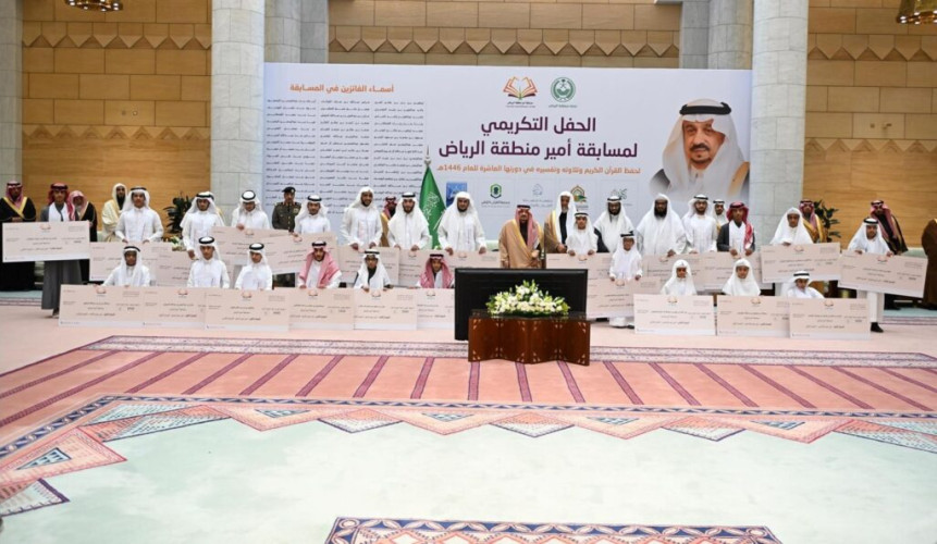 رعى صاحب السمو الملكي الأمير فيصل بن بندر بن عبدالعزيز أمير منطقة الرياض، في قصر الحكم اليوم، الحفل الختامي لمسابقة أمير منطقة الرياض لحفظ القرآن الكريم وتلاوته وتفسيره للبين والبنات في دورتها العاشرة لعام 1446هـ التي تنظمها الجمعية الخيرية لتحفيظ القرآن الكريم بالرياض (مكنون).