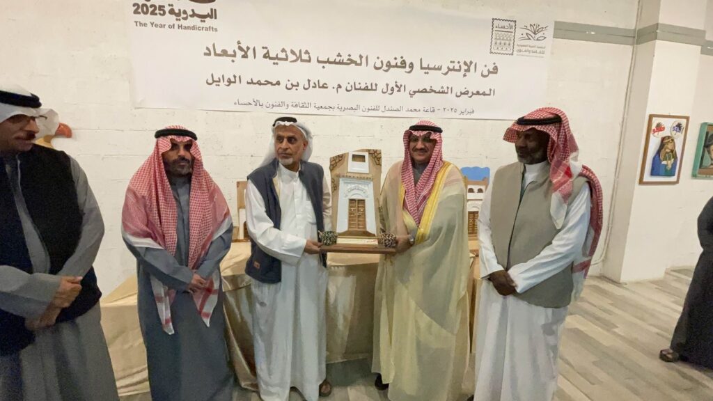 وأضاف الوايل بأن فن الانترسيا تتحقق من خلاله الكثير من المكتسبات خاصة المهارة في انتاج الاعمال الفنية والدروع والهدايا والتراثيات وابراز ثقافة وهوية البلد للزائر والسائح والضيف وللعالم اجمع وتوثيق هويتنا وتراثنا وثقافتنا ونشرها ليطلع عليها العالم.والاهم غرسه في نفوس ابنائنا كما يناسب تقديمه في الاماكن العامة والشوارع الرئيسية وايضا الدوائر الحكومية والفنادق وكدروع وهدايا لكبار الشخصيات ويكون بمثابة سفير يصدر تراثنا ويبين ثقافتنا للعالم ، وفي نهاية المعرض تم تكريم راعي المناسبة امين أمانة الاحساء المهندس عصام عبداللطيف الملا والرائد التشكيلي الفنان عبدالحميد البقشى تظير عطائه وتميزه وابداعه في المجال التشكيلي.