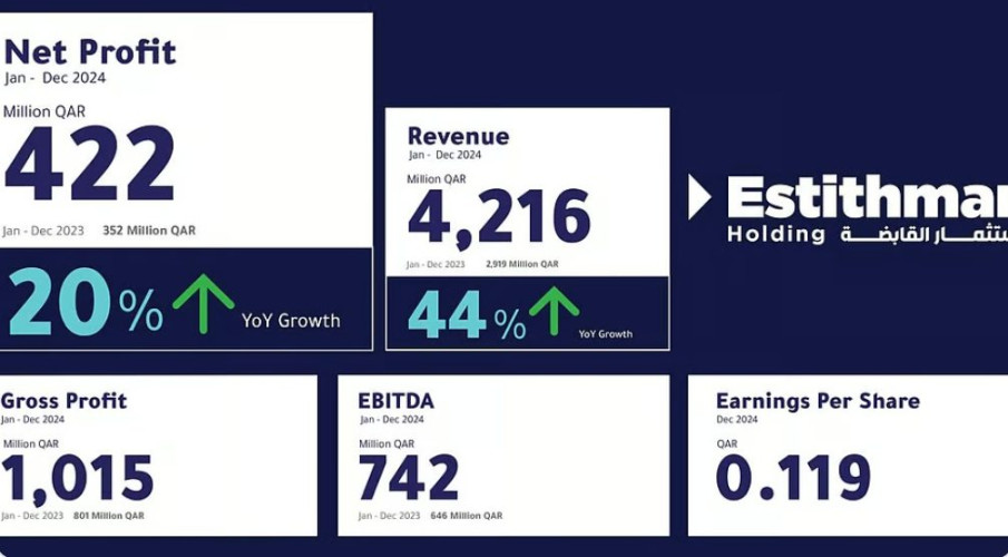 أعلنت استثمار القابضة ش.م.ع.ق عن نتائجها المالية للسنة المنتهية في 31 ديسمبر 2024، بعد اعتمادها من مجلس إدارة الشركة، مسجلة ارتفاع الإيرادات بنسبة 44% لتبلغ 4.2 مليار ريال قطري مقابل 2.9 مليار ريال قطري في 2023 ، وبلغ إجمالي أرباح الشركة مليار ريال قطري مقابل 801 مليون ريال قطري في 2023 بارتفاع 27%. كما حققت الشركة أرباحاً قبل اقتطاع الفائدة والضريبة والاستهلاك وإطفاء الدين بلغت 742 مليون ريال قطري وسجلت النتائج ارتفاعاً في صافي أرباح الشركة بنسبة 20% عن العام 2023 لتصل إلى 422 مليون ريال قطري. وقد ارتفع العائد على السهم عن عام 2023 بنسبة 17% ليصل إلى 0.119 ريال قطري.