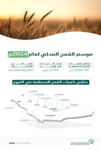 وتقوم الهيئة العامة للأمن الغذائي بشراء القمح المحلي تنفيذًا لقرار مجلس الوزراء رقم (439) وتاريخ 6 /6/ 1445هـ القاضي بالموافقة على قيام الهيئة بشراء القمح من المزارعين، لمدة (خمس) سنوات، بما لا يتجاوز مليونًا ونصف المليون طن لكل عام.
