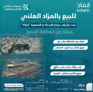 ويعتبر المزاد فرصة واعدة للباحثين عن الفرص الاستثمارية النامية، كما ترحب مجموعة عبدالغني القاضي للعقارات بجميع الاستفسارات من خلال التواصل على: 0553637111.