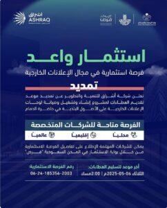 أعلنت شركة أشراق للتنمية والتطوير، الذراع التنموي لأمانة المنطقة الشرقية، عن تمديد موعد تقديم العطاءات لمشروع إنشاء وتشغيل وصيانة لوحات الإعلانات الخارجية على الأصول البلدية في حاضرة الدمام والذي يهدف إلى إضفاء بعد جمالي للمنطقة الشرقية وتمكين نماذج استثمارية متنوعة للشراكة مع القطاع الخاص.