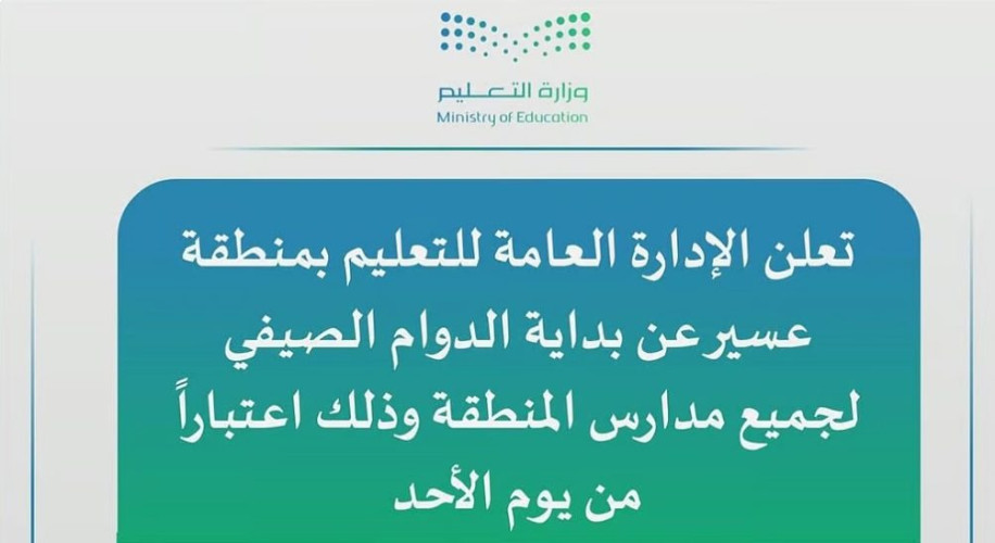 أعلنت الإدارة العامة للتعليم بمنطقة عسير العمل بالتوقيت الصيفي في مدارس التعليم العام ابتداءً من الأحد القادم 8 شوال الجاري.