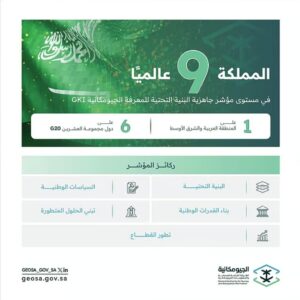 حققت المملكة ممثلة- بالهيئة العامة للمساحة والمعلومات الجيومكانية- مرتبةً متقدمة في مؤشر جاهزية البنية التحتية للمعرفة الجيومكانية (GKI) لعام 2025م، وتقدمت المملكة في التصنيف من (المرتبة 32) عام 2022م إلى (المرتبة 9) على مستوى دول العالم، (الأولى على منطقة الشرق الأوسط والعالم العربي، والسادسة على دول مجموعة العشرين “G20”)، إذ جاء الإعلان عن ذلك خلال اليوم الأول من المنتدى الجيومكاني العالمي 2025 (Geospatial World Forum) المنعقد في العاصمة الإسبانية مدريد خلال الفترة من 22 إلى 25 إبريل الجاري.
