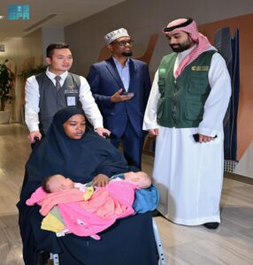 إنفاذًا لتوجيهات خادم الحرمين الشريفين الملك سلمان بن عبدالعزيز آل سعود، وصاحب السمو الملكي الأمير محمد بن سلمان بن عبدالعزيز آل سعود ولي العهد رئيس مجلس الوزراء -حفظهما الله- وصل مطار الملك خالد الدولي بالرياض، اليوم، التوأم الملتصق الصومالي “رحمة ورملا” برفقة ذويهم، قادمين من جمهورية الصومال الفيدرالية، حيث نُقل التوأم فور وصولهما إلى مستشفى الملك عبدالله التخصصي للأطفال بوزارة الحرس الوطني؛ لدراسة حالتهما والنظر في إمكانية إجراء عملية فصلهما.