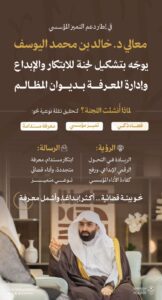 وجّه معالي رئيس ديوان المظالم، رئيس مجلس القضاء الإداري، د. خالد بن محمد اليوسف، بتشكيل لجنة للإبداع والابتكار وإدارة المعرفة بديوان المظالم تقوم على دعم أفكار ومشاريع الإبداع والابتكار من منسوبي ودوائر وإدارات ديوان المظالم، وكل ما من شأنه تطوير أداء الأعمال وأدواته، وما يدعم ذلك من معرفة وعلوم وتدريب وتطوير.
