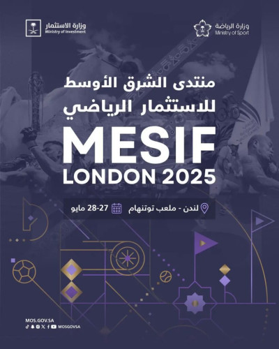 تشارك وزارة الرياضة كشريك إستراتيجي في فعاليات منتدى الشرق الأوسط للاستثمار الرياضي (MESIF)، الذي تُنظّمه وزارة الاستثمار في الفترة من (27 – 28) مايو الجاري، وذلك في مقر ملعب نادي توتنهام هوتسبير في العاصمة البريطانية لندن، وسط حضور نخبة من صنّاع القرار، والمستثمرين، وممثلي الجهات المعنية بالاستثمار الرياضي من مختلف أنحاء العالم.