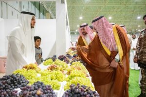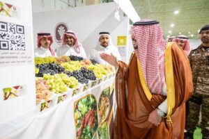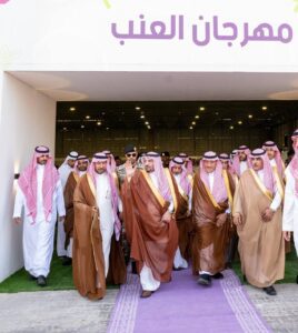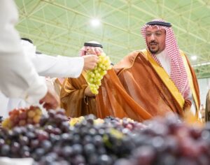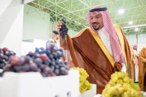 واطلع سموه خلال الجولة على منتجات مزارع العنب المشاركة، من خلال (60) معرضًا، يتضمن محاصيل قرابة (100) مزرعة لأكثر من (25) نوعًا، وإنتاج يصل إلى أكثر من (50) ألف طن، وما تضمه من تنوع في الأصناف وجودة في الإنتاج، إلى جانب الصناعات التحويلية المستخلصة من ثمار العنب، التي تعكس القيمة الاقتصادية المتنامية لهذا المنتج الزراعي الحيوي، كما تجوّل سموه في أجنحة المهرجان، مطلعًا على الفعاليات المصاحبة والعروض التي تبرز دور المزارعين ورواد الأعمال المحليين.