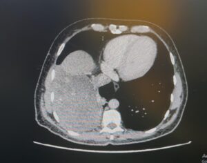 وعلى الفور تمت دراسة الحالة مع فريق جراحة الأوعية الدموية، حيث تم وضع خطة علاجية دقيقة تحسبًا لاحتمالية التصاق الورم بالأوعية الدموية الكبرى. وتم تنويم المريض بشكل عاجل وتجهيزه لنقله إلى غرفة العمليات الجراحية، ذلك لإجراء عملية باستخدام المنظار الجراحي للصدر مع إجراء فتحة جانبية للمساعدة في إخراج الورم نظرًا لضخامته.