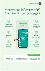 وأشارت إلى أن تطبيق “مرشدك الزراعي”، حقق العديد من المنجزات والجوائز منذ إطلاقه، وتميز بصفته واحدًا من أفضل التطبيقات الرقمية الخدمية في المنطقة؛ حيث حصل التطبيق على عدة جوائز، أبرزها، درع الحكومة الرقمية العربية كأفضل تطبيقٍ عربي، وجائزة اتحاد الأصدقاء للأمم المتحدة لتنمية الاستدامة، إضافةً إلى شهادة الآيزو للجودة، كما حقق التطبيق أرقامًا قياسية، من أبرزها تقديم أكثر من (6.4) ملايين استشارة فنية للمزارعين، كما تجاوز عدد المزارعين المسجلين في التطبيق (282) ألف مزارع، إلى جانب (441) مرشدًا متخصصًا، مبينةً أن التطبيق وردت إليه خلال الفترة المذكورة، أكثر من (1.5) مليون مكالمة صوتية، فيما تجاوز إجمالي عدد الرسائل النصية الإرشادية (3.6) ملايين رسالة، فيما بلغ عدد الاستشارات المقدمة لقسم اسأل عن نبات وآفة، أكثر من مليون استشارة، كما قدّم التطبيق للمزارعين نحو (1700) تنبيه عن حالة الطقس بحسب ما يعلن من المركز الوطني للأرصاد، و(687) حلقة بث مباشر إرشادية، إضافةً إلى (7945) خبرًا ومحتوىً إرشاديًا منشورًا، و (337) تحليلًا للتربة والمياه.