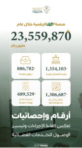 وأفاد المركز بأن عدد الدعاوى التي تم تقديمها خلال الاثني عشر شهرًا الماضية بلغ 886,782 دعوى، فيما بلغ عدد الجلسات القضائية الرقمية التي عُقدت عبر منصة “مُعين” الرقمية 1,354,103 جلسات قضائية، كما بلغ عدد المذكرات التي تم إيداعها وتبادلها خلال ذات الفترة بين أطراف الدعاوى 1,306,687 مذكرة، وفي سياق الأحكام بلغ عدد نسخ الأحكام النهائية والتنفيذية التي تم إنجازها 689,529 نسخة.