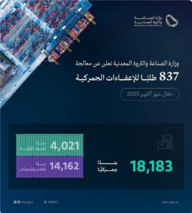 في إطار جهودها لتعزيز تنافسية الصناعة الوطنية، عالجت وزارة الصناعة والثروة المعدنية 837 طلبًا لخدمة الإعفاء الجمركي الصناعي خلال شهر أكتوبر 2025م.