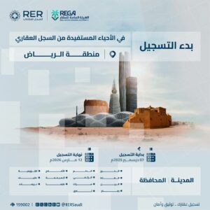 ويجب على ملاك العقارات الواقعة في نطاق الأحياء تسجيل عقاراتهم قبل نهاية يوم الخميس 12مارس 2026م، ويمكن التحقق من موقع العقار إذا كان ضمن المناطق المعلنة من خلال منصة السجل العقاري.