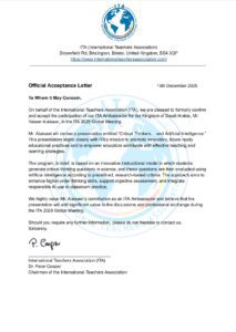 شارك الاستاذ ياسر جزاء العيساوي في ملتقى رابطة المعلمين الدولية (International Teachers Association) الذي عُقد في المملكة المتحدة، بعرض برنامج تربوي تطبيقي بعنوان «مفكر ناقد… وذكاء اصطناعي»، يهدف إلى تنمية مهارات التفكير الناقد ومهارات التفكير العليا لدى الطلاب، من خلال توظيف تقنيات الذكاء الاصطناعي في تعليم العلوم، وذلك في إطار تبادل الخبرات التعليمية العالمية، والاطلاع على الممارسات التربوية الحديثة.
