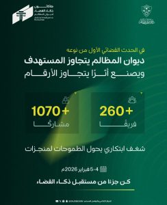 أعلن ديوان المظالم عن انتهاء مرحلة فرز الفِرق المتقدمة في هاكاثون ذكاء القضاء والتي بلغت أكثر من 260 فريقًا ابتكاريًا من مختلف التخصصات والجهات المشاركة، ضمّت أكثر من 1000 متنافس ابتكاري، تقدموا بأفكار ومقترحات ضمن مسارات الهاكاثون المعلنة مسبقًا.