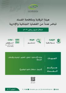 باشرت هيئة الرقابة ومكافحة الفساد “نزاهة” عدداً من القضايا الجنائية والإدارية خلال شهر يناير 2026، ضمن جهودها المستمرة لتعزيز مبادئ النزاهة ومكافحة الفساد في الجهات الحكومية.