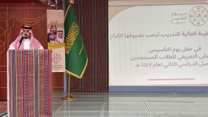واستُهل الحفل بالسلام الملكي، ثم تلاوة آيات من القرآن الكريم، في مشهد يجسد الاعتزاز بالجذور الراسخة للدولة السعودية الممتدة منذ ثلاثة قرون. عقب ذلك، ألقى سعادة الرئيس التنفيذي كلمة رحّب فيها بالحضور، مؤكدًا أن الاحتفاء بيوم التأسيس يمثل محطة وطنية مهمة لتعزيز قيم الانتماء والولاء، وترسيخ الوعي بتاريخ الوطن العريق في نفوس الأجيال، مشددًا على أن هذه المناسبة فرصة متجددة لتعزيز الهوية الوطنية وترسيخ القيم التي قامت عليها هذه الدولة المباركة، مع التأكيد على التزام المعهد بتقديم بيئة تدريبية نوعية تواكب احتياجات سوق العمل وتسهم في إعداد كوادر وطنية مؤهلة تدعم تحقيق مستهدفات رؤية المملكة 2030.