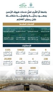 أسهمت جامعة أمِّ القرى في تقديم منظومة متكاملة من الجهود البحثية والتطوعية والتدريبية خلال شهر رمضان المبارك 1447هـ؛ دعمًا لخدمة قاصدي الحرمين الشريفين من الزوار والمعتمرين، وارتقاءً بجودة الخدمات المقدمة لهم؛ بما يواكب مستهدفات رؤية المملكة 2030.