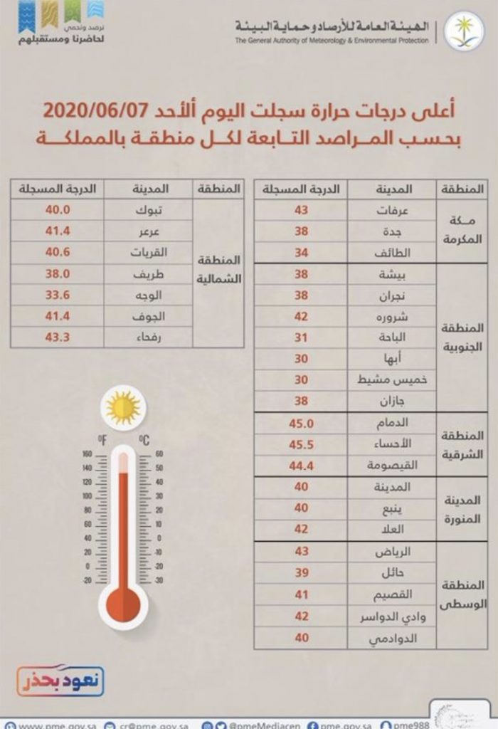 أوضحت الهيئة العامة للأرصاد وحماية البيئة أن أعلى درجات الحرارة التي سُجلت اليوم (الأحد) في المملكة كانت في المنطقة الشرقية.