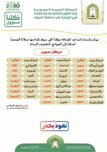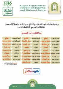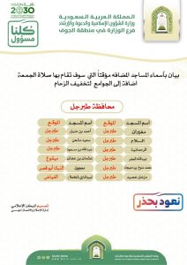 وأوضح مدير عام الفرع الشيخ عواد بن سبتي العنزي أنه تماشياً مع الإجراءات الاحترازية التي تطبقها حكومة خادم الحرمين الملك سلمان بن عبدالعزيز – حفظه الله – ، وإنفاذاً لتوجيهات وزارة الشؤون الإسلامية والدعوة والإرشاد قفد أضيفت عدد من المساجد لتقام فيها صلاة الجمعة مؤقتا لتخفيف أعداد المصلين على الجوامع حفاظا على صحتهم من انتقال العدوى فيما بينهم لا سمح الله وذلك في إطار الإجراءات الاحترازية المتبعة، مع الحرص على تطبيق الجوامع والمساجد التعليمات الصادرة من قبل الوزارة.