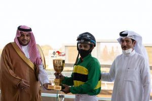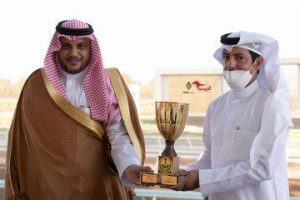 وسلم المشرف العام على سباقات الطائف خالد بن إبراهيم العشري جائزة النادي التقديرية للمدرب شالح العضياني بعد فوز الفرس ( مصقولة الجيد ) العائد ملكيتها لإسطبل أبناء الشريف هزاع بن شاكر العبدلي التي حققت المركز الأول في سباق الشوط الرابع .