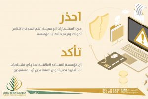 وحذرت المؤسسة مما تقوم به بعض الجهات والمواقع المشبوهة من انتحالٍ سافر لهوية المؤسسة وصفتها عبر نشر عددٍ من الأخبار الوهمية باسم المؤسسة العامة للتقاعد في محاولةٍ منها للوصول إلى أموال العملاء والاستيلاء عليها بطرقٍ غير مشروعة.