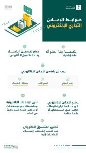 ونشرت الوزارة إنفوجرافًا بهذا المضمون، مشيرة إلى أنه لابد أن يتضمن الإعلان بيان يوضح أنه مادة إعلانية، كما يمنع تضمين أي إدعاء يخدع المتسوق الإلكتروني، ويجب أن يتضمن الإعلان الإلكتروني اسم المنتج، واسم التاجر، ووسائل الاتصال. كما يمنع الإعلان الإلكتروني لأي علامة تجارية لا يملك التاجر حق استخدامها، كما يجب أن تكون الإعلانات الإلكترونية وما تضمنته من عروض أو مواصفات ملزمة للتاجر وجزء من العقد، كما يجب تمكين المتسوق الإلكتروني من طلب إيقاف إرسال الإعلانات إليه.