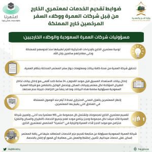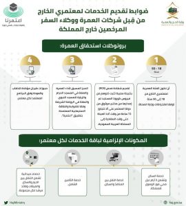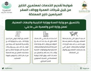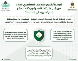 وضحت وزارة الحج والعمرة ضوابط تقديم الخدمات لمعتمري الخارج من قبل شركات العمرة ووكلاء السفر المرخصين خارج المملكة وذلك مع بدء استقبال ضيوف الرحمن من مختلف دول العالم تدريجيًا اعتباراَ من يوم الأحد القادم بإذن الله.