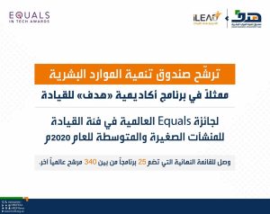 ترشح صندوق تنمية الموارد البشرية(هدف)ممثلًا في برنامج أكاديمية “هدف” للقيادة، لجائزة Equals العالمية في فئة القيادة للمنشآت الصغيرة والمتوسطة للعام 2020م، ووصوله للقائمة النهائية التي تضم 25 برنامجًا من بين 340 مرشحًا عالميًا آخرًا، حيث تنظم الجائزة بالتعاون مع هيئة الأمم المتحدة للمرآة ومنظمة الأمم المتحدة للتربية والعلم والثقافة.