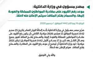 صرَّح مصدر مسؤول في وزارة الداخلية بأنه إلحاقًا للبيان الصادر بتاريخ 25 محرم 1442 هجرية الموافق 13 سبتمبر 2020 ميلادية، القاضي بأن يكون رفع القيود على مغادرة المواطنين المملكة والعودة إليها، والسماح بفتح المنافذ لعبور جميع وسائل النقل بعد تاريخ 17 جمادى الأولى 1442 هجرية الموافق 1 يناير 2021 ميلادية؛ تود وزارة الداخلية أن توضح أن موعد رفع القيود على المغادرة، والسماح بفتح المنافذ، سيتم الإعلان عنه لاحقاً.