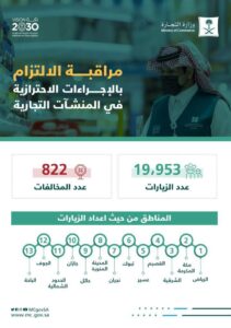 نفذت الفرق الرقابية لوزارة التجارة(19,953)زيارة تفتيشية خلال الأسبوع الماضي لمراقبة التزام المنشآت التجارية ومنافذ البيع في كافة مناطق المملكة بتطبيق الإجراءات الاحترازية والتدابير الوقائية لمواجهة فيروس “كورونا”.