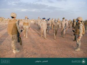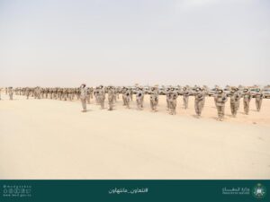 وقال معاليه في كلمة القاها امام الضباط وضباط الصف من الوحدات المتقدمة المتواجدة بالمنطقه “بالفخر بالتواجد بينهم في مواقع العز والشرف مشيداً بالمواقف الشجاعة والبطولية في الدفاع عن دينهم وملكهم ووطنهم، والتأكيد على المعنويات العالية والمستوى المتميز الذي يتمتعون به في أداء الواجبات والمهام الموكلة لهم”، وفي ختام الجولة شارك معاليه وجبة الإفطار مع الوحدات المتقدمة متمثلة في قوة الواجب(٣٧).
