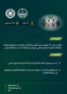 صرَّح المتحدث الرسمي للمديرية العامة لمكافحة المخدرات الرائد محمد النجيدي، بأن المتابعة الأمنية الاستباقية لنشاطات الشبكات الإجرامية التي تستهدف أمن المملكة وشبابها، أسفرت عن القبض على(4)مقيمين من الجنسية الباكستانية بمنطقة الرياض، ضبط بحوزتهم(81,660)قرصًا خاضعًا لتنظيم التداول الطبي.