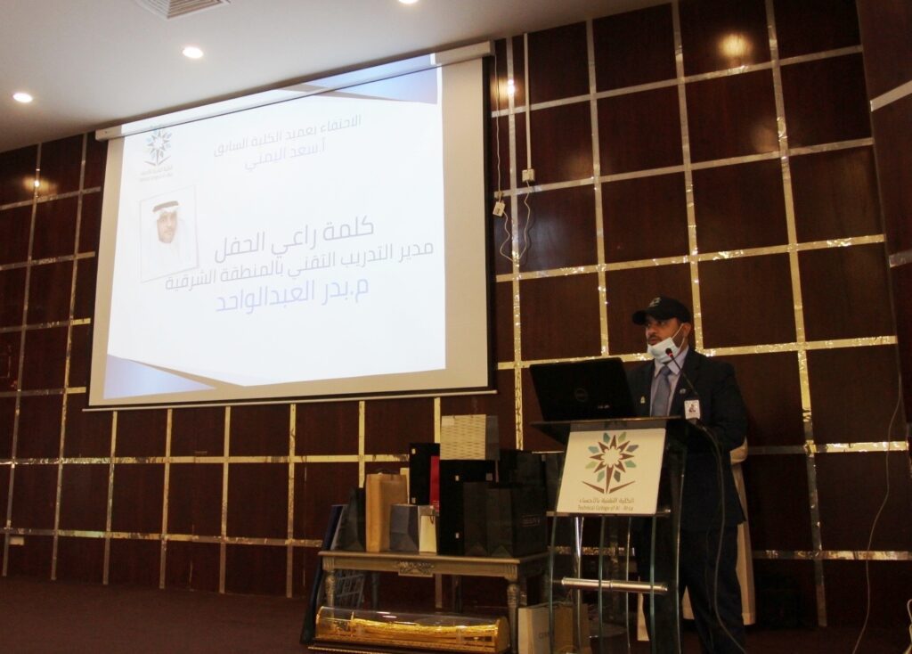كما ألقى مدير عام التدريب التقني والمهني بالمنطقة الشرقية المهندس بدر العبدالواحد كلمة أعرب فيها عن سعادته الكبيرة لما رآه من حفاوة وتكريم من منسوبي الكلية لعميدهم السابق وإن دل على شيء إنما يدل على الحب الكبير الذي زرعه اليمني في نفوسهم وانعكس ذلك الحب إيجابياً على جودة العمل في الكلية ، وأشاد بالجهود الكبيرة والفاعلة التي بذلها اليمني على مستوى الكلية أو الإدارة العامة بالمنطقة أو على مستوى المؤسسة العامة للتدريب التقني والمهني .