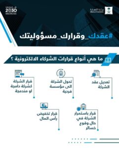 وأوضحت الوزارة أن ضمن القرارات الأخرى التي تمكن الشركاء من الاستفادة من هذه الخدمة تشمل تحول كيان الشركة إلى شكل آخر، وتلك المتعلقة بعمليات الاندماج وقرارات استمرار الشركة، بما في ذلك القرارات المتعلقة بتعديل رأس مال الشركة، شريطة ألا تتعارض تلك القرارات المقدمة للوزارة مع أحكام نظام الشركات، وكذلك الأنظمة الأخرى ذات الصلة. وفي هذا السياق؛ وأن يتعهد الشركاء بصحة المعلومات الواردة في تلك القرارات المقدمة وتوافقها مع أحكام نظام الشركات والأنظمة الأخرى المشار إليها.