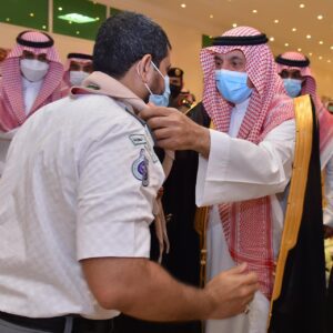 ثم شاهد سمو أمير المنطقة والحضور عرضاً مرئياً عن مسابقات نشاطي، ومساراتها المتعددة وبرامجها المختلفة، ثم أُقِيمت مسيرة للطلاب والطالبات الفائزين بالمسابقات، تلا ذلك تقليد سموه الشارة الخشبية للقادة الكشفيين المجتازين لمتطلباتها.