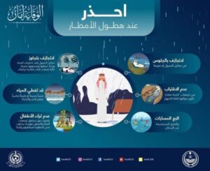 وقالت عبر إنفوجرافيك نشرته في حسابها بتويتر: “عند سقوط الأمطار؛ عدم المجازفة بالجلوس في مجاري السيول أو عبورها أو الاقتراب من تجمعات المياه حيث تكون حوافها قابلة للانهيار”.
