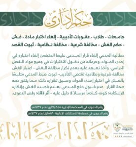 وكان المدعي قد طالب بإلغاء القرار المتضمن إلغاء اختباره في إحدى المواد وحرمانه من دخول الاختبارات في جميع مواد الفصل الدراسي، وأخذ تعهّد عليه بعدم تكرار مخالفة الغش، باعتباره مخالفة شرعية ونظامية تقتضي التأديب.