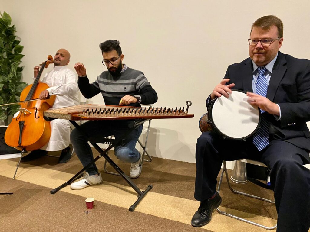 وتجول مدير الجمعية الأستاذ علي الغوينم بالضيوف في أقسام الجمعية المختلفة حيث اطلعوا من خلالها على مدى الجهود المبذولة في اتاحة الفرصة للمواهب الفنية المختلفة بأن تبرز طاقاتها سواء في المسرح أو الموسيقى أو الفنون التشكيلية و المقهى الثقافي فيما شارك القنصل الأمريكي بالعزف مع فرقة الجمعية الموسيقية بقيادة قائدها الفنان ابراهيم الورثان وأبدا سعادته بما شاهده .
