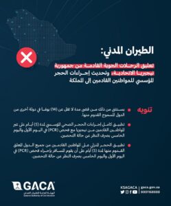 أصدرت الهيئة العامة للطيران المدني، تعليماتها للناقلات الجوية بشأن تعليق الرحلات الجوية القادمة من جمهورية نيجيريا الاتحادية وإليها، وتحديث إجراءات الحجر المؤسسي المعتمدة للمواطنين القادمين إلى المملكة من الدول المعلق القدوم منها.