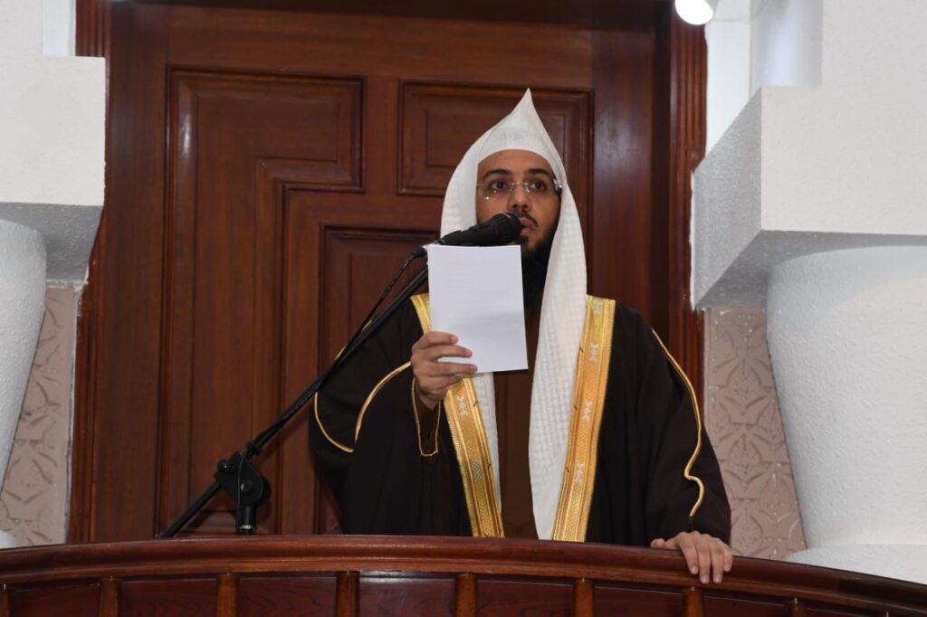 حيث أم المصلين رئيس المحكمة العامة بالأحساء فضيلة الشيخ لؤي بن يوسف الراشد، الذي تطرق في خطبته إلى عبادة الاستغفار والتوبة، وأنها دأب الأنبياء والصالحين، وبين أهمية لزوم التوبة وكثرة الاستغفار ؛ لكونهما أمان من العذاب وسبب لتفريج الكربات واستجلاب الأرزاق، كما أشار إلى سعة رحمة الله وأنه لا ضيق معها، وأهمية طلبها من الله مباشرة دون واسطة.