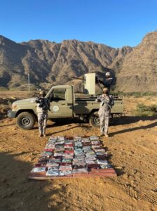 صرح المتحدث الرسمي للمديرية العامة لحرس الحدود العقيد مسفر القريني، بأن المتابعة الأمنية لمروجي ومهربي المخدرات، أسفرت عن إحباط محاولة تهريب (2.8) مليون قرص إمفيتامين مخدر، والقبض على مستقبلها بالتعاون والتنسيق مع المديرية العامة لمكافحة المخدرات وقوات أمن المنشآت، عبر الحدود الشرقية للمملكة، كما تم إحباط محاولات تهريب (627) كيلو جراماً من مادة الحشيش المخدر، و(28) طناً و(946) كيلوجراماً من مادة القات المخدر، عبر الحدود الجنوبية للمملكة.
