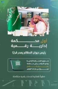 أصدر معالي رئيس ديوان المظالم رئيس مجلس القضاء الإداري الشيخ الدكتور خالد بن محمد اليوسف قرارا بتحويل المحكمة الإدارية بوادي الدواسر إلى محكمة رقمية بالكامل، تُدار وتمارس أعمالها وتتلقى جميع الطلبات وتقدم خدماتها بشكل رقمي -عن بعد- اعتبارًا من 15 / 8 /1443هـ لتصبح أول محكمة إدارية رقمية.