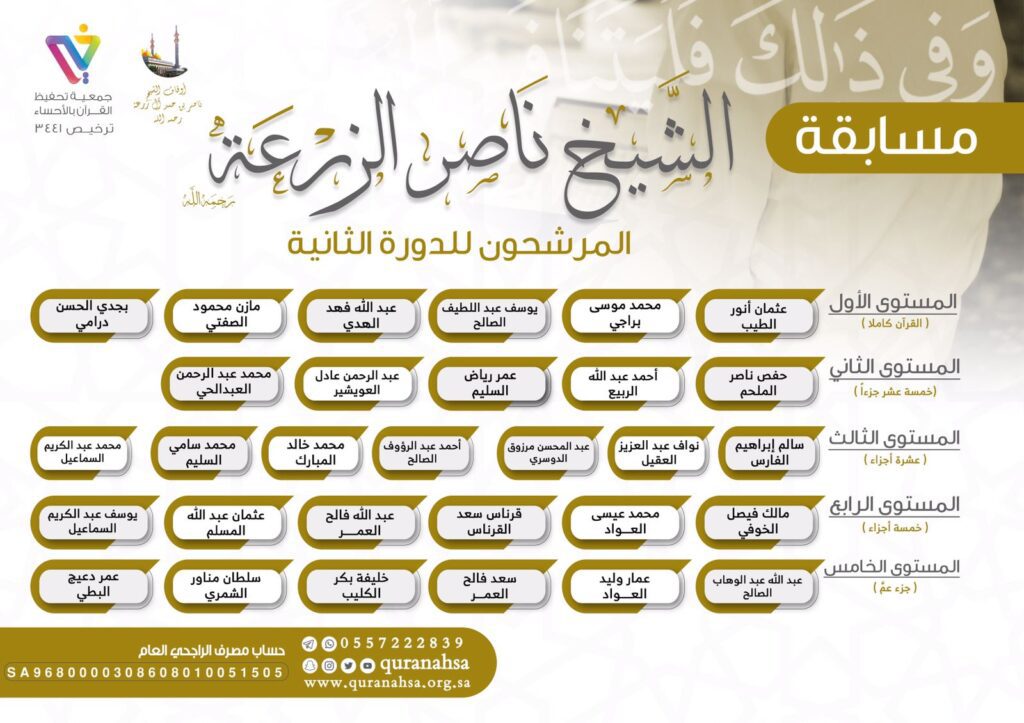 برعاية كريمة من أوقاف الشيخ ناصر بن حمد آل زرعة (رحمه الله) وبإشراف جمعية تحفيظ القرآن الكريم بمحافظة الأحساء(خير )، انتهت أحداث الدورة الأولى من مسابقة الشيخ ناصر الزرعة (رحمه الله) للقرآن الكريم، حيث شارك فيها أكثر من ٢٠٠ متسابق على سبع جولات، وشارك فيها ٨ حكّام خلال الفترة السابقة، وبنهاية الدورة الأولى انتقل ٣٠ متسابقا للمنافسة في الدورة الثانية من المسابقة ( ٦ متسابقين من كل فرع)، والتي ستقام بإذن الله يوم الأحد ١٤٤٣/٨/١٠هـ.