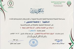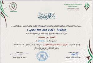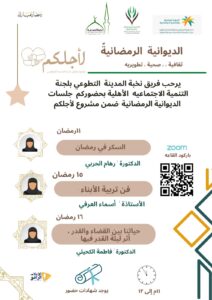 اختتم فريق نخبة المدينة التطوعي بلجنة التنمية الاجتماعية الاهلية بالمدينة المنورة برنامج الديوانيه الرمضانية ضمن مشروع لاجلكم مساء يوم الأحد ١٦ رمضان ١٤٤٣ حيث شملت على ثلاث جلسات تناولت موضوعات صحية ، و تربوية ، وثقافية عبر منصة زووم من الساعة الحادية عشر مساء الى الثانية عشرة صباحا.وتحدثت قائدة فريق نخبة المدينة التطوعي الأستاذة : أسماء العرفي بأن جلسات الديوانية شملت على ثلاث جلسات بدأت بموضوع ( السكر في رمضان) قدمتها الدكتورة : رهام ضيف الله الحربي ، وشملت الجلسة الثانيه برنامج فن تربية الابناء قدمتها الاستاذة : أسماء العرفي ، وانتهت الجلسة الثالثة ببرنامج : حياتنا بين القضاء والقدر قدمتها الدكتورة : فاطمة الكحيلي ..
